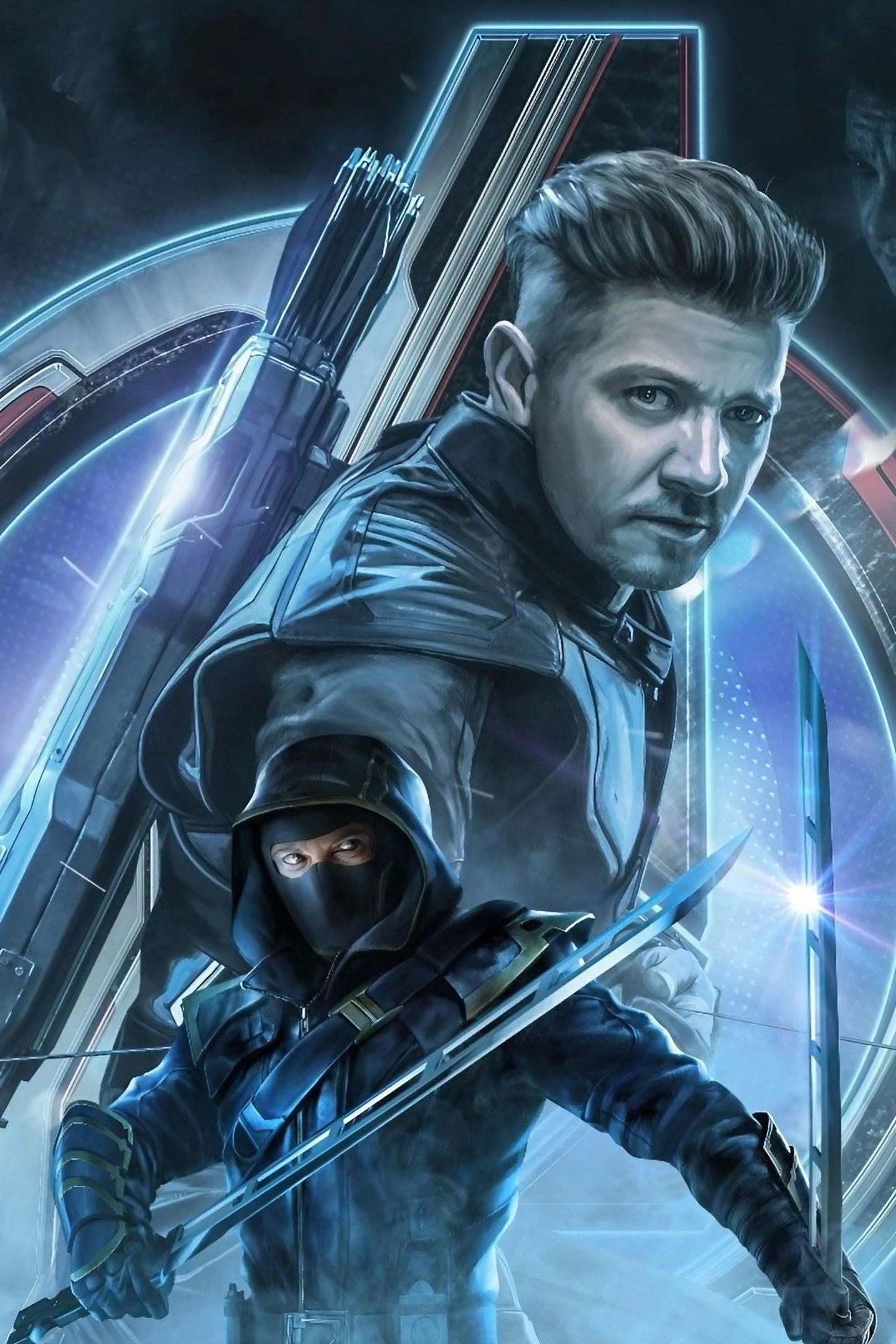 The poster features Clint Barton, aka Hawkeye, in a dynamic pose atop a rooftop at night, with the glowing cityscape of New York City behind him. He’s mid-action, bow drawn, arrow nocked, his intense gaze locked on a target off-screen. His iconic black and purple tactical suit is sleek and practical, equipped with a quiver full of high-tech trick arrows strapped to his back.